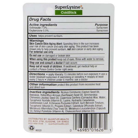 Quantum Health, Super Lysine Plus ColdStick Lip Protectant And Treatment, Cold Stick SPF21 5 GM
